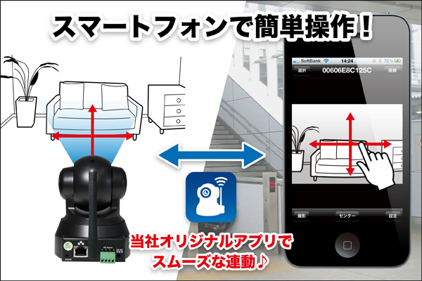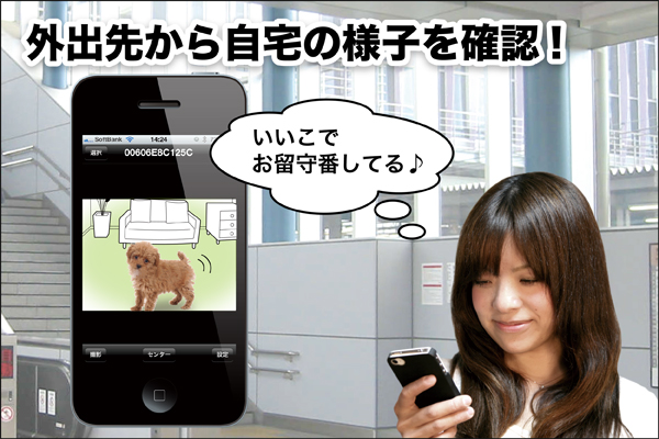 また、近年、普及が進んでいるスマートフォン(iPhone/Android)にいち早く対応し、今までの、パソコンでの複雑な設定や操作が必要であったIPカメラをスマートフォン特有のスワイプ操作*2でカメラを首振り・ピンチ操作*3で映像を拡大などに対応する事で、より直感的な操作が可能です。また、設定もスマートフォン単独で行えるため、パソコンが無い家庭でも利用が可能です。