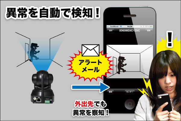 本カメラには人感センサーが内蔵されています。人感センサーをONにし、通知先メールを設定しておくと、カメラの前を人が通った場合に、自動的に数枚、静止画を撮影し、通知先にメールを送信。