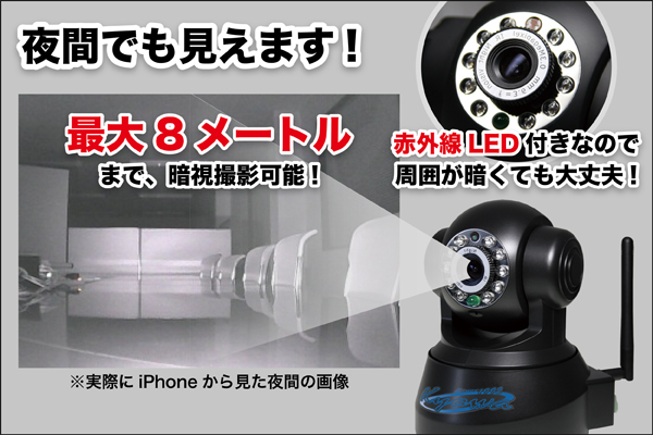 本カメラには赤外線LEDが搭載されています。そのため、夜間でも最大8m先まで監視する事ができます。