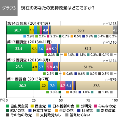 最多支持政党は、自民党20.7%(前回22.4%、1位)、2位日本共産党4.9%(前回5.0%、4位)、3位民主党4.1%(前回5.5%、3位)、4位日本維新の会2.9%(前回5.6%、2位)、5位みんなの党2.3% (前回4.8%、5位)になりました。