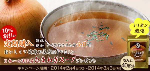 【内 容】 期間中にミリオン株式会社のECサイト「ミリオンストア」で健康飲料等の対象商品を定期購入で新規お申込みされた方全員に、“カラダの中から温め健康や美容に優しい淡路島産玉ねぎスープ”をもれなくプレゼントします!