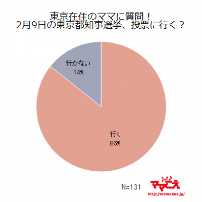 東京都に在住するママたちに、「東京在住のママに質問!2月9日の東京都知事選挙、投票に行く?」(n=131)と聞いたところ、「行く」が86%に達しました。この選挙の注目度の高さがうかがえます。
