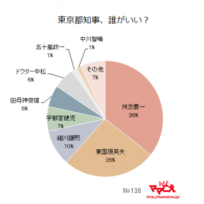 一方、ママたちに東京在住の有無を問わず、「東京都知事、誰がいい?」(n=138)と聞いたところ、36%で舛添要一氏がトップ。そして、今回出馬を断念した東国原英夫氏(26%)、脱原発をアピールする細川護煕氏(10%)が続きました。