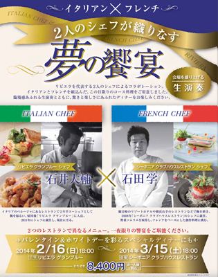 リビエラを代表する2人のシェフによるコラボレーション。イタリアンとフレンチを組込んだ、この日限りのコース料理をご用意しました。カンツォーネの生演奏とともに、驚きと楽しさにあふれたディナーをお楽しみください。