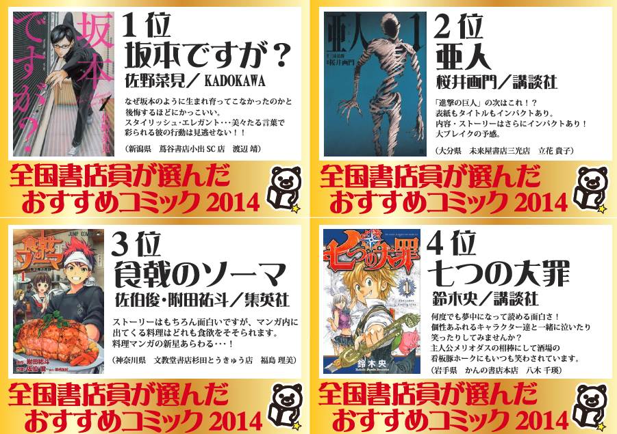 このフェアは、日販が全国の書店員に対して“刊行5巻以下”の“人に薦めたいコミック”をアンケート調査し、投票結果に基づいて店頭展開を行う、毎年恒例の企画です。今回は過去最多の2,250名の書店員(1,680書店)が投票に参加しました。その結果、1位には「坂本ですが?」(KADOKAWA)、2位に「亜人」(講談社)、3位には「食戟のソーマ」(集英社)がランクインしました。