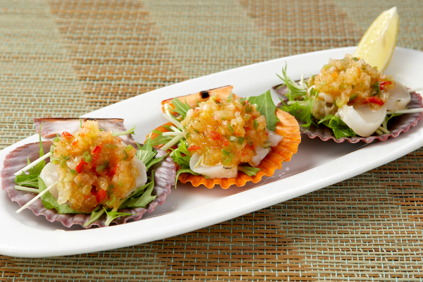 貝殻によって色が違う、見ていても楽しい「桧扇貝」。帆立に似た食感ですが、味はそれよりも濃厚。ほんのり甘い桧扇貝と細かく刻んだ香味野菜をサラダ仕立てにしました。