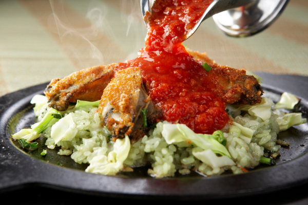 アツアツの鉄板にのせた、春キャベツ・チーズ・ライス、そして「フライした広島県産牡蠣」。そこにトマトベースのシズリングソースを「ジュワー!!」と豪快にかけて仕上げます。身が詰まったプリプリの食感と旨みにトマトの香りがくせになります。