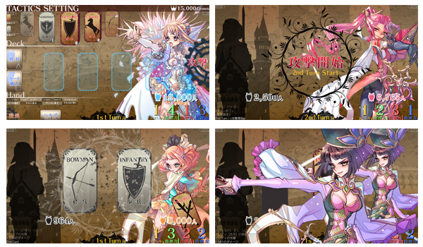 カードバトルとは戦力となる「兵種カード」と呼ばれるカードを選択し、互いのカード を出し合いカードの優劣で勝敗が決するもので、誰もが簡単に楽しむことができます。相手の思考を読み、的確な兵種カードを出し、敵の兵力を0にする事で勝利をつかむことが できます。
