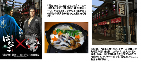 株式会社セクションエイト(本社:東京都渋谷区 代表取締役社長:横山 淳司)は、全国に店舗展開する「北海道厳選素材 新鮮炙り焼き 居酒屋はなこ」(以下「居酒屋はなこ」)で株式会社セガ(本社:東京品川区、代表取締役社長 COO:鶴見 尚也) が 2014年2月22日に発売する「龍が如く」シリーズ最新作 「龍が如く 維新!」との期間限定コラボキャンペーンを実施いたします。