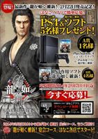期間、PlayStation(R)4などが当たるキャンペーンを行なっております。PlayStation(R)4本体+ソフト「龍が如く 維新!」セットを1名様、PlayStation(R)3用「龍が如く 維新!」ソフトを4名様、 計5名様にプレゼント致します。