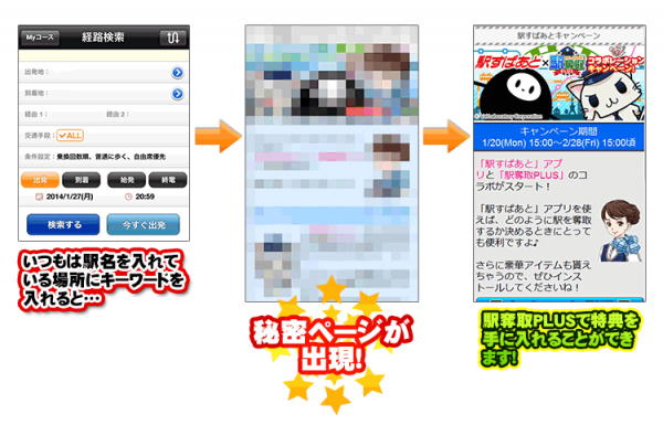株式会社モバイルファクトリー(本社:東京都品川区、代表取締役:宮嶌裕二)は、株式会社コロプラ(代表取締役社長:馬場功淳、本社:東京都渋谷区)が運営する位置情報サービスプラットフォーム「コロプラ」上 で提供する位置情報連動型ゲーム「駅奪取PLUS」にて、2014年2月6日より、株式会社ヴァル研究所(本社:東京都杉並区、代表取締役:中山秀昭)の運営するスマートフォンアプリ「駅すぱあと」と提携し、キャンペーンを実施します。