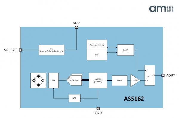 AS5162非接触型磁気位置センサに関する詳細は、以下にてご確認ください。www.ams.com/products/position-sensor/AS5162.