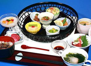 内容: ・百合根豆富 ・牛蒡つくね巻き ・うぐいす和え ・寒干し大根風呂吹き ・カレー唐揚げ ・卯の花カレー風味サラダ ・白魚の茶碗蒸し ・刺身 ・小鉢 ・梅ちりめん御飯 ・香物 ・プチ餃子スープ ・デザート