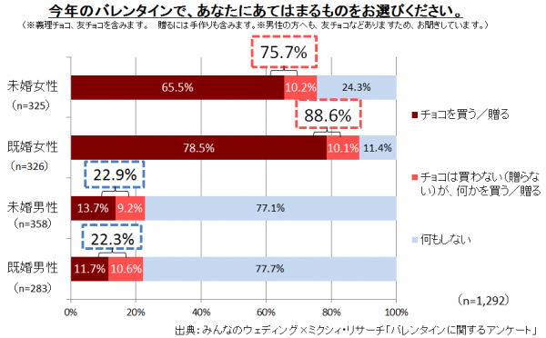 「今年のバレンタインで、あなたにあてはまるものをお選びください。(義理チョコ、友チョコを含みます。贈るには手作りも含みます。)※男性の方へも、友チョコなどありますため、お聞きしています。」という設問では、「チョコを買う/贈る」「チョコは買わない(贈らない)が、何かを買う/贈る」という回答の合計が、未婚女性は75.5%となったのに対し、既婚女性は88.6%となりました。また、男性でも未婚男性の22.9%、既婚男性の22.3%が「チョコ、何かを買う/贈る」という結果となりました。