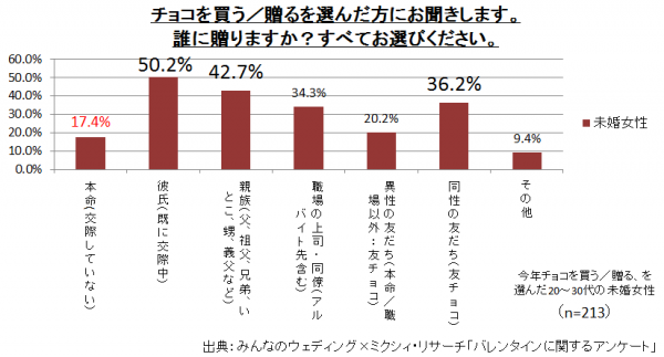 「Q.チョコを買う/贈る、を選んだ方にお聞きします。誰に贈りますか?すべてお選びください。 」という未婚女性への設問では、トップが「彼氏(既に交際中)(50.2%)」となり、次いで「親族(42.7%)」「同性の友だち(36.2%)」「職場の上司・同僚(34.3%)」となり、「本命」は17.4%という結果となりました。