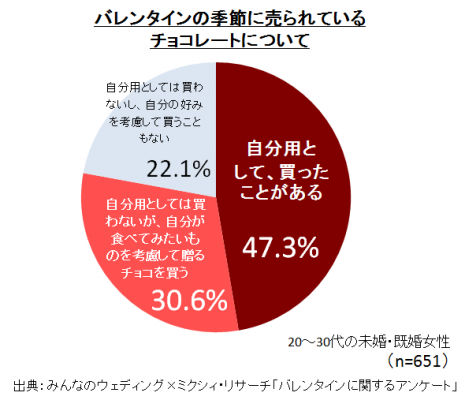 ■女性のバレンタインチョコ、「自分用として買ったことがある(47.3%)」「自分用ではないが自分が食べてみたいものを考慮して買う(30.6%)」
