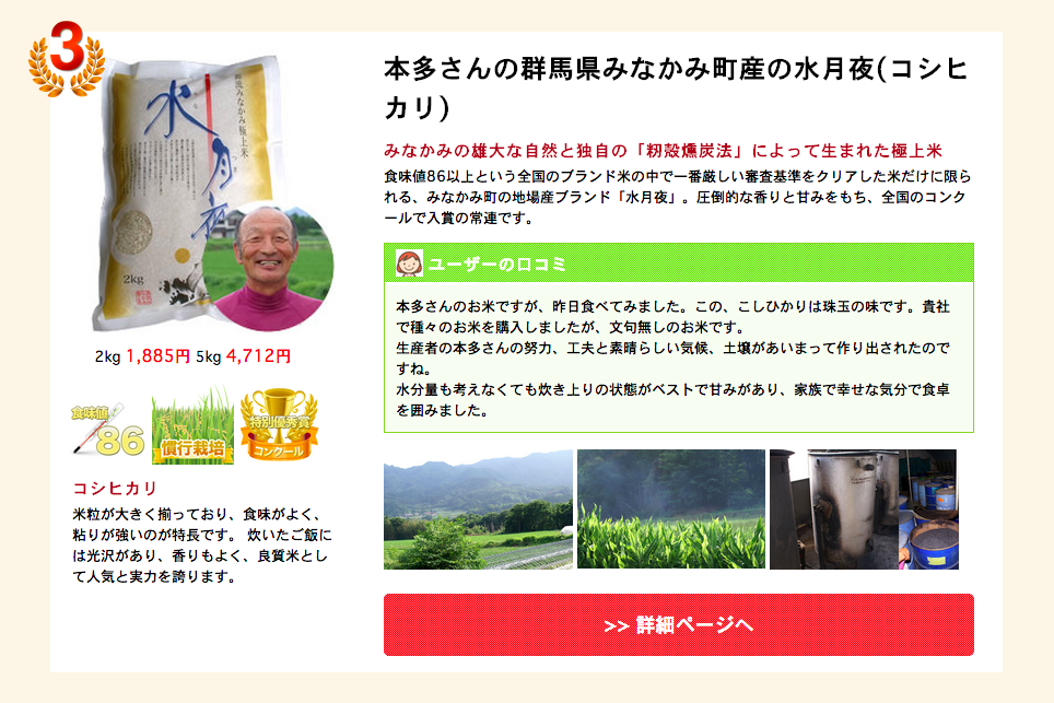 第3位:本多義光さんの群馬県みなかみ町産の水月夜(コシヒカリ)