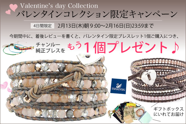 インポートファンは、新作発売記念として、2月13日朝9:00~2月16日23:59までの4日間限定で、”バレンタインコレクション限定キャンペーン”を行います。期間中にバレンタイン限定デザインのブレスレットを1個ご購入&商品到着後レビューを書いていただくと、チャンルーのブレスレットを1個プレゼントいたします。(注文の際に必ず、到着後Shop&商品レビューを書く?:書く【CHAN LUU純正ブレス】を選択。)