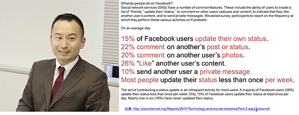 築地: たくさんあるんですが、まずはツールだけに過剰に期待し過ぎないで下さいとお伝えしています。Facebookでも毎日自分のステータスをあげている人なんて15%程度。ましてや企業内で投稿率80%なんて無理な話しです。そんな目標は立てないでください、と。10%くらいの投稿率が保たれていれば十分に活性化されている状態ですし、風土の変革やイノベーション創出のためのインフラとして、十分投資対効果に見合っているものですよ、と。