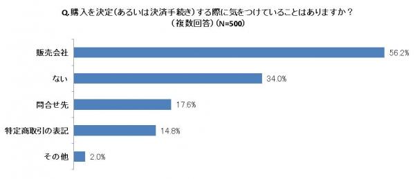 「(インターネットショッピング利用時の)購入を決定(あるいは決済手続き)する際に気をつけていることはありますか?」という質問に対しては、56.2%が「販売会社」をチェックしていると回答しました。「問い合わせ先」や「特定商取引の表記」はいずれも10%台と少なく、一方で34.0%が「ない」と回答しました。特に20代では47.0%が「ない」と回答し、ほぼ半数に警戒心がないという実態が浮き彫りになりました。