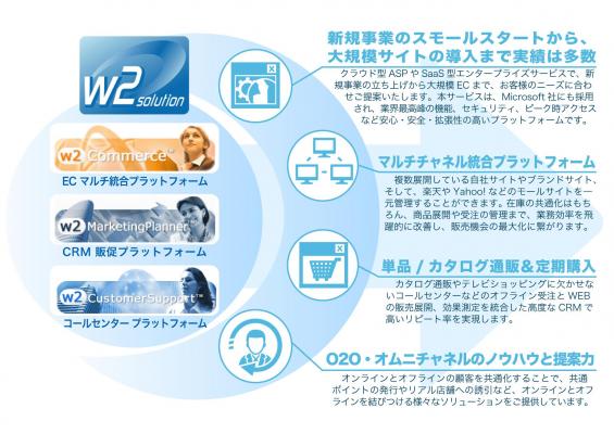 「w2Commerce」は、自社独自開発し、予算・用途・ニーズに応じて最適なECサイト構築および運営を実現する、柔軟性・拡張性・堅牢性に優れたパッケージです。中・大規模ECサイトを安定稼働させ、更なる成長をサポートする事を強みとしています。