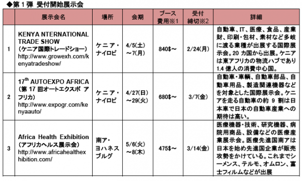※1:ブース費用は最も安価なものを呈示しています。また、ケニアについては弊社経由で申し込んだ場合の特別価格です。空き状況や展示内容によって価格は変動しますので予めご了承ください。