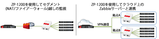 VPN通信はHTTPプロキシ経由で利用することも可能なため、拠点のファイアーウォールの設定変更を行わず、データセンターやクラウド上にインストールされたZabbixサーバーへ安全に監視データを送信することが可能です。