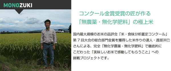 日本最大のお米コンクール「米・食味分析鑑定コンクール」第7回大会の総合部門で金賞を受賞した米づくりの匠・渡部洋巳さん(山形県置賜郡高畠町)が「完全無農薬・無化学肥料」に徹底的にこだわって、プレミアム米(品種:ミルキークィーン)を栽培することを、クラウドファンディングサービス「MONOZUKI」にて支援するプロジェクトです。