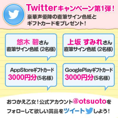 公式アカウント『@otsuoto』をフォローして指定の文言をツイートした方に豪華声優陣の直筆サイン色紙やGoogle Playギフトカード、AppStoreギフトカードをプレゼントします。