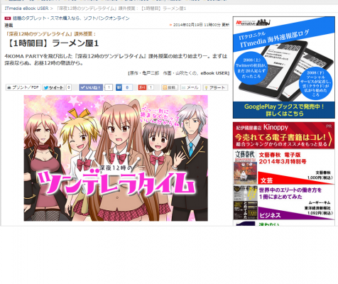 日本最大級のIT系ニュースサイトである「ITmedia」の中でも電子書籍/電子出版にフォーカスした「ITmedia eBook USER」にて、番外編として「深夜12時のツンデレラタイム」の掲載がスタートします。2月は19日(水)24日(月)26日(水)28日(金)の11時に掲載予定です。「4KOMA PARTY」で連載中の本編とは一味違ったツンデレラワールドをお楽しみいただけます。