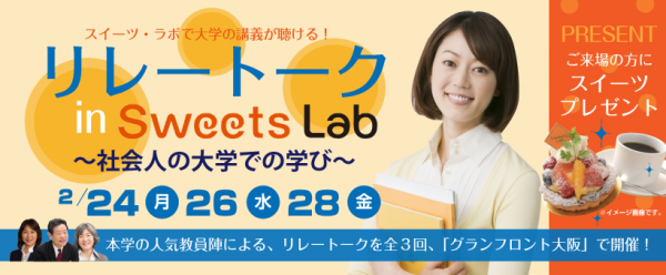 大手前大学通信教育課程(兵庫県西宮市)は、グランフロント大阪(大阪市北区)のスイーツ・ラボにおいて、昨年末から続くスイーツ&ドリンク付無料セミナー「リレートークin Sweets Lab」の第5回を2月26日(水)に開催いたします。今回は、大手前栄養学院 仲谷 伸子 准教授が「『発達する』ってどんなこと? ~発達心理学から人生に大切なことを考える~」をテーマに講演を行います。