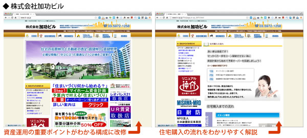 今回のリニューアルでは、トップページのイメージ変更の他、不動産の購入から、売却、資産運用における重要なポイントがわかる内容に注力し、ナビゲーションを全面的に改修。「住宅購入の流れ」、「賃貸住宅経営成功のポイント」、「経営サポート」などのコンテンツを充実させ、詳細な説明と丁寧なサポートで不動産売買、資産運用を目的としたユーザが安心して相談できるコンテンツに仕上がっています。