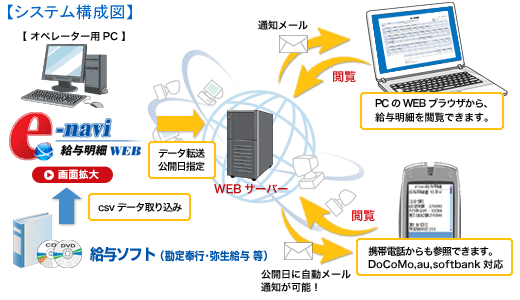 市販給与計算ソフトで作成された給与明細書を電子化して、従業員のパソコン・携帯電話・スマートフォンから専用ウェブサイトを通じて閲覧可能とするサービスです。
