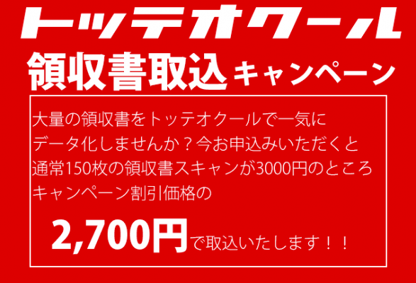 スキャンマン株式会社ではキャンペーンとして、トッテオクール利用の領収書スキャニング料金を、通常150枚3,000円のところ、10%オフの2,700円とさせていただきます。(150枚以降は1枚あたり20円)