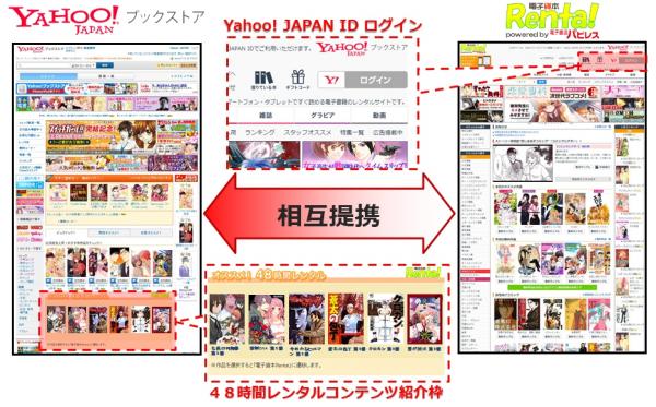 これにより、ポータルサイト「Yahoo! JAPAN」内の電子書籍サービス「Yahoo!ブックストア」のお客様は、電子書籍販売サイト「電子貸本 Renta!」のレンタルコンテンツのサービスを利用することができるようになりました。これにより、「Yahoo! JAPAN」のお客様は、「電子貸本Renta!」のレンタルコンテンツを、Yahoo! JAPAN IDですぐに利用することができるようになります。新たに個人情報を登録することなく、安心して「電子貸本Renta!」を利用できます。同時に「電子貸本Renta!」のお客様は、「Yahoo!ブックストア」のコンテンツのサービスを利用することができるようになりました。
