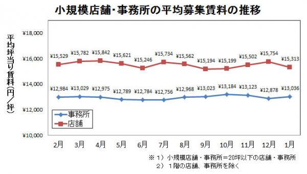 小規模店舗(20坪以下)の平均募集賃料は、1月に前月比2.8%下降しましたが、2012年の秋以降、1.5 万円台半ば程度で安定的に推移しています。