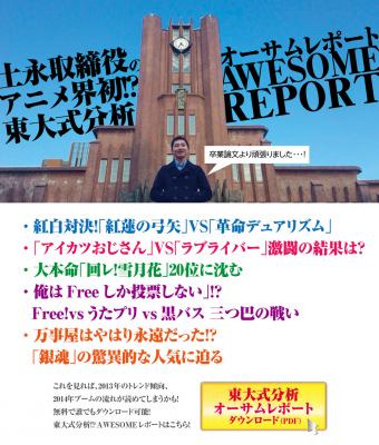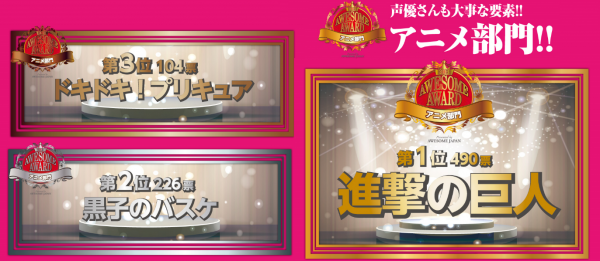 無料で読めるWEB4コマ漫画メディア「4KOMA PARTY(http://4komaparty.com/)」を運営する株式会社AWESOME JAPAN(本社:東京都台東区、代表取締役:金野 太一)は、日本最大級のアニソンイベント総合サイト「アニイベZ」と共同で実施した、2013年度最もユーザーの心に響いたAWEOSOME(良い意味でヤバイ)なアニメ、マンガ、劇場アニメ、アニソンを決定する「AWESOME AWARD2013」の集計・分析結果を公開いたしましたのでお知らせいたします。