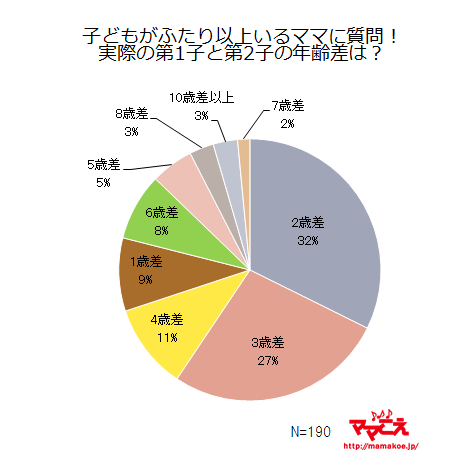 「子どもがふたり以上いるママに質問! 実際の第1子と第2子の年齢差は?」(n=190)と聞いたところ、「2歳差」(32%)、「3歳差」(27%)で全体の約6割、年子である「1歳差」(9%)を含めると約7割に達するという結果になりました。