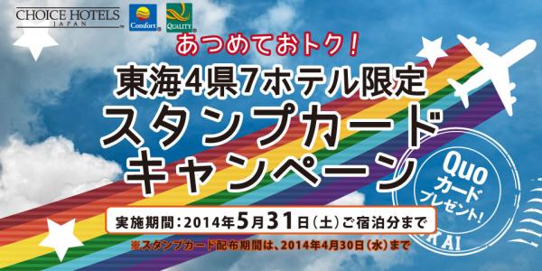 株式会社チョイスホテルズジャパン(本社:東京都中央区、代表取締役社長:村木 雄哉)は、2014年2月24日(月)から2014年5月31日(土)まで、東海4県にあるコンフォートホテル7店舗(岐阜、浜松、名古屋チヨダ、豊川、刈谷、中部国際空港、鈴鹿)にて、「東海4県7ホテル限定スタンプカードキャンペーン」を実施いたします。