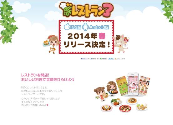 エニッシュの「ぼくのレストランII」は、2010年7月に配信開始以降3年以上に渡り300万人以上ものユーザー様にお楽しみいただいているロングランヒット作です。今回配信開始が決定した『ぼくのレストラン3』は、多くのユーザー様に支持されているゲームシステムを活かし、ネイティブアプリならではの多彩な機能・優れた操作性・かわいらしいグラフィックで大幅にパワーアップしたゲームとなっております。また、配信開始決定を記念し本日2014年2月24日(月)よりティザーサイト(http://www.bokures3.com )をオープンしました。お得なキャンペーン情報も随時掲載予定ですので、是非ご覧ください。