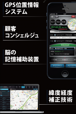 現在地近くの顧客までの距離と社名をプッシュ表示。周辺情報表示と報告時のGPS情報の強弱を自動で切り替えることでバッテリーの持ちを向上させ、かつ正確な位置情報を取得し報告することを実現した特許出願技術。