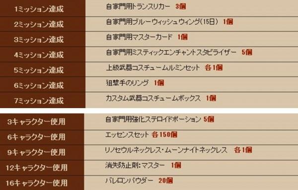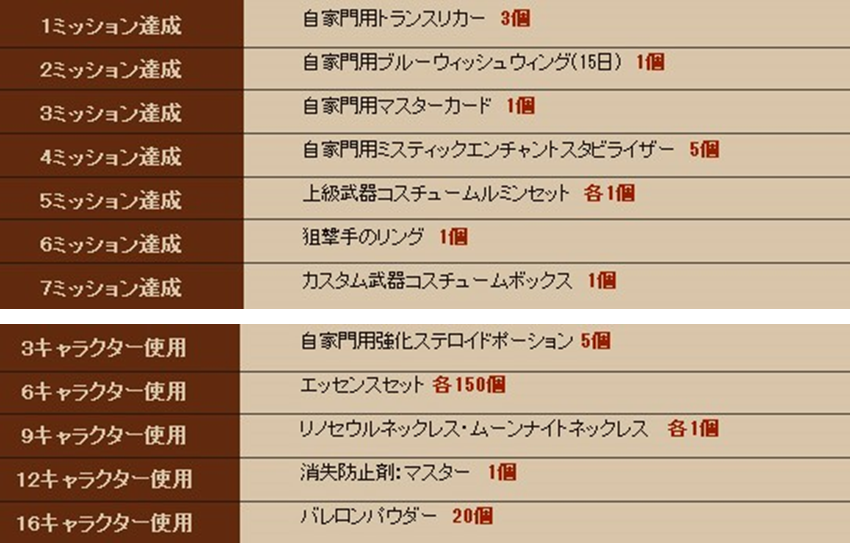 ミッションクリアとキャラクター使用の、2つの条件で報酬アイテムをもらうことができます。全ての報酬アイテムをもらうには、7ミッションをクリアする間に対象の16キャラクターを全員使用する必要があります。
