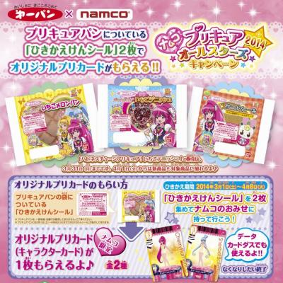 第一屋製パンの「ハピネスチャージプリキュア!」キャラクターパンに貼付される「ひきかえけんシール」2枚を、2014年3月1日(土)から4月8日(火)のプレゼント交換期間中、全国にあるナムコ直営アミューズメント施設のキャンペーン実施店舗にお持ちいただくと、「ナムコ限定プリカード(キャラクター)」(数量限定/全2種)が1枚もらえます。