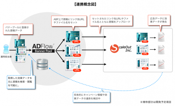 日本で最も多くのバナーを制作し、広告主や大手広告代理店、制作プロダクションなど200社以上が導入しているバナー制作管理ツール『ADFlow(アドフロー)を提供する株式会社クリエイターズマッチ(本社:東京都渋谷区、代表取締役:呉京樹、よみ仮名:ゴ ケイジュ)は、アドテクノロジーの進化によって激増するバナー原稿を、バナーに特化したデータベースで管理できる『ADFlow Banner Pool(アドフロー・バナープール、以下ABP)』と、株式会社スケールアウト(本社:東京都江東区、代表取締役社長:山崎 大輔)が提供する『ScaleOut』との連携を2014年3月3日より開始しました。