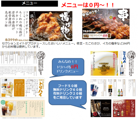 オープンするまでの約半年「相席屋であたらしい出会いを」のコンセプトのもと、メニューはもちろん、お店のシステム、ホームページやWEB関連、内装や外装、PRなどすべてセクションエイトが企画。「ロシアンたこやき」や「お仕置きビスケット」など盛り上がる罰ゲームメニューも考案し、皆で盛り上がること間違い無し!!お客様を「おもてなし」するセクションエイトのノウハウを活かしお客様との出会いはもちろん、お客様同士の出会いが素敵なものになるように「相席屋」がおもてなしいたします。ビジネスに繋がる人脈作りや友達作りにぜひご活用ください。