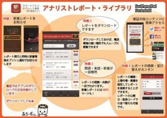 株式会社東京証券取引所では、投資者の皆様がアナリストレポートをより手軽にご利用いただくことを目的として、スマートフォン・タブレット端末向けのアナリストレポート閲覧アプリ「アナリストレポート・ライブラリ」(開発/運用:株式会社ステークホルダーコム)を通じてレポートを無料(通信料別途)で提供しております。