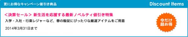 販促ノベルティ卸売りセンターでは、通常の卸売価格よりも更にお得な!値引きキャンペーンを期間限定で開催します。是非、お得なこの機会に名入れノベルティをご検討ください。お得な値引き期間は、2014年3月31日まで。