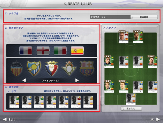 リーグは、フランス、イングランド、イタリア、スペインの4つから選べます。ここで選んだリーグで活躍する選手が、初期メンバーとしてキミのチームに加わります。例えばスペインを選べば、現在スペインリーグに所属している選手の中からランダムでラインナップされます。