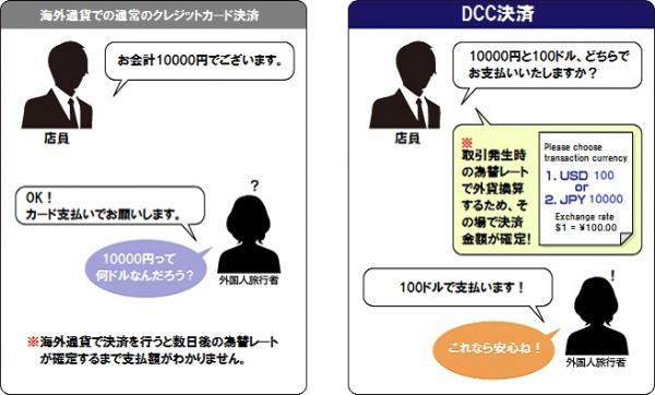 DCC(ダイナミック・カレンシー・コンバージョン)決済は、外国人観光客など海外発行のクレジットカードでお支払いをされるお客様に、お支払い金額(円価格)をその場で外貨換算し自国通貨でお支払いいただくことを可能とする外貨建てクレジットカード決済サービスです。