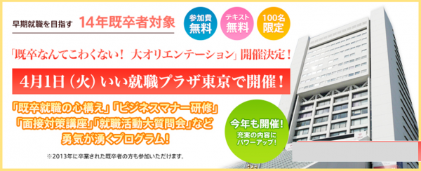 既卒者および第二新卒者の就職支援サービスを手掛ける、いい就職プラザ【運営:ブラッシュアップ・ジャパン(株)東京都新宿区 代表:秋庭洋】では、4月から新たに既卒となる2014年3月卒業の既卒者100名を対象に、4月1日(火)『既卒なんかこわくない!大オリエンテーション』を開催いたします。参加費は無料。2013既卒者の参加も可。